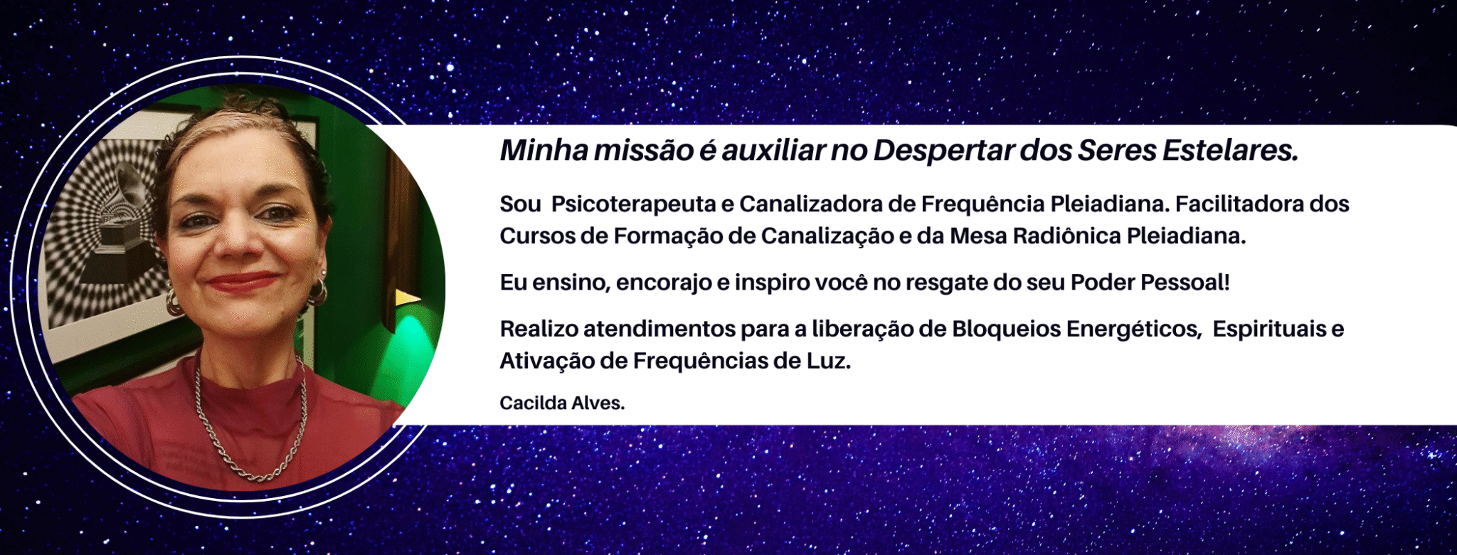 “O curso de Canalização Pleiadiana foi um chamado da minha alma! Ouvir a história da Cacilda e ver como muitas coisas da história dela também batiam com a minha foi incrível! Me senti de volta ao lar depois de um longo período de viagem, a energia e tudo ali me soava tão familiar… Já sou terapeuta e agreguei o que aprendi nesse curso em meus atendimentos, tem sido maravilhoso não só para mim, como também para outras pessoas que são tratadas por essa energia. Não tem quem não sinta de imediato a energia se elevar, o bem-estar, o alívio. Para você que é terapeuta, eu indico muito esse curso para trabalhar com essa energia maravilhosa que é a dos Pleiadianos. Para você que não é terapeuta, também indico muito esse curso para poder entrar mais em contato com a energia desses seres tão amorosos, além de poder se tratar e tratar aos que você ama. Sobre a Cacilda, sou suspeita para falar porque admiro demais o trabalho dela, recomendo a todos que posso!! Fica aqui minha gratidão aos amigos Pleiadianos pelo chamado e à Cacilda pelo lindo trabalho compartilhado agora por seus cursos. Beijo grande!” Marli Fabreti.